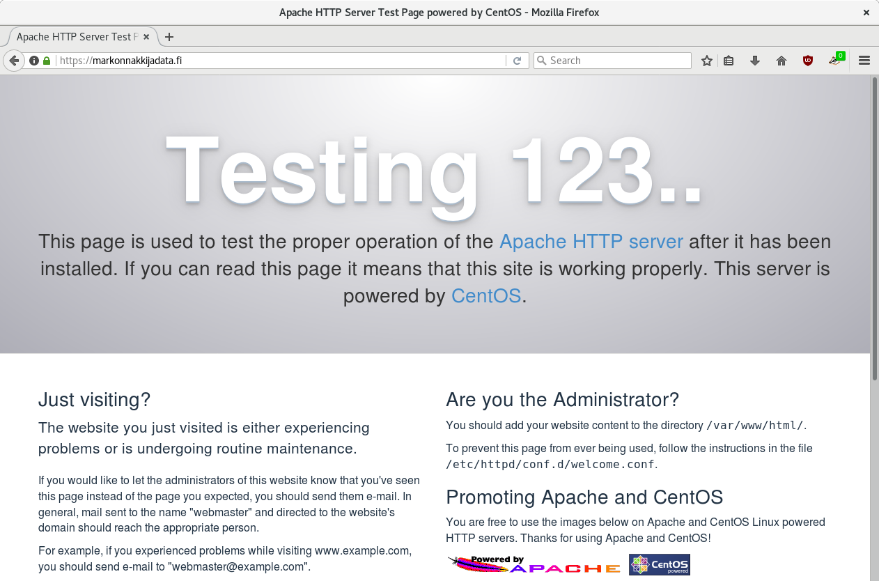 Testataan palvelun toimivuus. HTTPS:n pitäisi toimia palvelussa, minkä erottaa mm. vihreän lukon kuvasta selaimen osoiterivin vieressä.