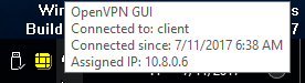 Yhteyden muodostuttua sovelluksen ikkuna katoaa ja kuvake muuttuu vihreäksi. Kun hiiren osoittimen vie kuvakkeen päälle, OpenVPN kertoo yhteyden tilan.