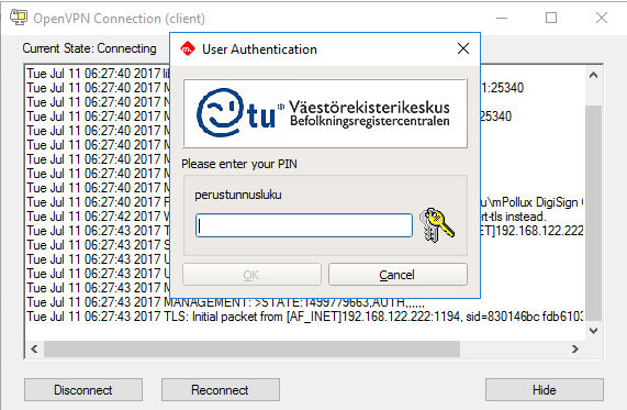 Tämän jälkeen OpenVPN yrittää muodostaa yhteyttä. Jos käyttäjän työasemassa on asennettuna tarvittavat toimikortinlukija-ajurit ja kortti on lukijassa, DigiSign-client pyytää PIN-koodia.