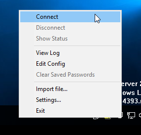 Kopioidaan ca.crt -tiedosto palvelimelta asetustiedostossa mainittuun paikkaan. Tämän jälkeen käynnistetään OpenVPN, joka menee tehtäväpalkin kuvakkeeksi (system tray). Klikataan kuvaketta oikealla napilla, valitaan "Import File..." ja valitaan aiemmin luotu asetustiedosto. Tämän jälkeen valitaan samasta valikosta "Connect".