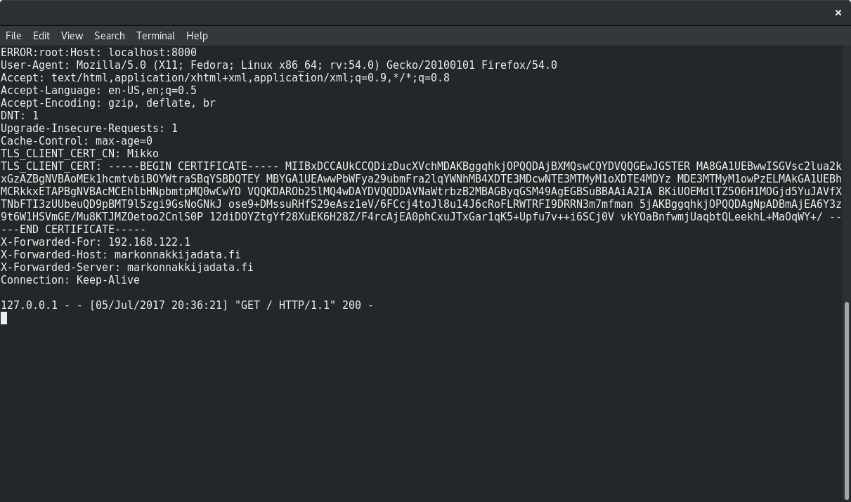 Kun käyttäjä kirjautuu varmenteella web-palveluun, sovelluspalvelin tulostaa vastaanottamansa pyynnön. Otsaketiedoista löytyvät TLS_CLIENT_CERT_CN ja TLS_CLIENT_CERT, kuten oli tarkoituskin.